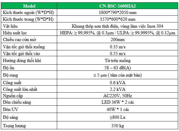 Khoang làm việc: Buồng áp suất âm và hai lớp xung quanh đảm bảo không rò rỉ, không ô nhiềm. Cửa sổ phía trước sử dụng hệ thống nâng treo và kính cường lực dày ~ 5mm. Cửa kính có thể dễ dàng làm sạch. Vùng làm việc bằng Inox 304 có thể vệ sinh. Khoang chứa dưới vùng làm việc có dung tích 4 lít
