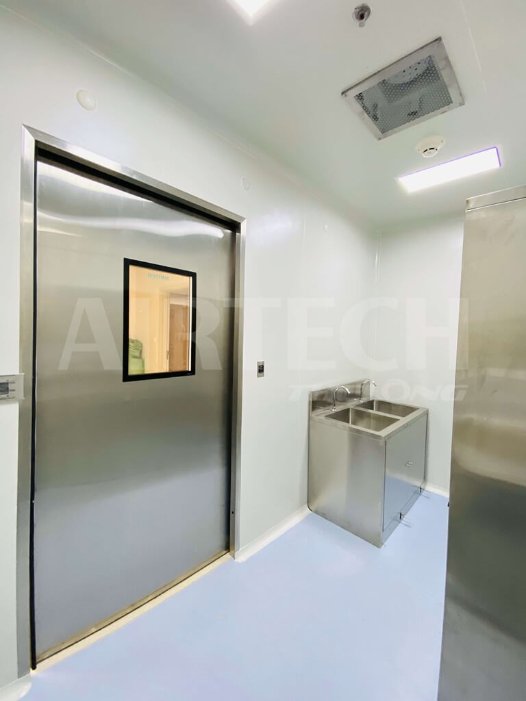 Cửa tự động trượt 1 cánh của Airtech Thế Long không chỉ thuận tiện mà còn giúp duy trì áp suất không khí trong phòng đệm. Cửa được trang bị cảm biến hiện đại, tự động mở và đóng khi có người đi qua, giảm thiểu tối đa sự xâm nhập của bụi bẩn từ bên ngoài.